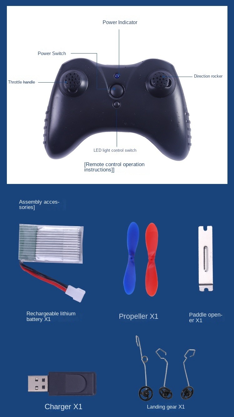 2.4GHz 2CH aircraft, including 4 directional flying, ascending, descending, turning left, and turning right.